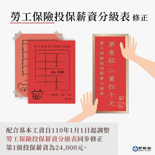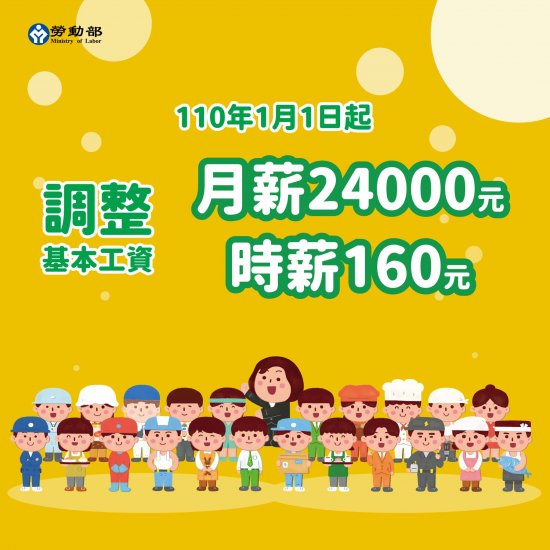 110年1月1日起,基本工資調整為月薪24,000元 ; 時薪調整為160元
